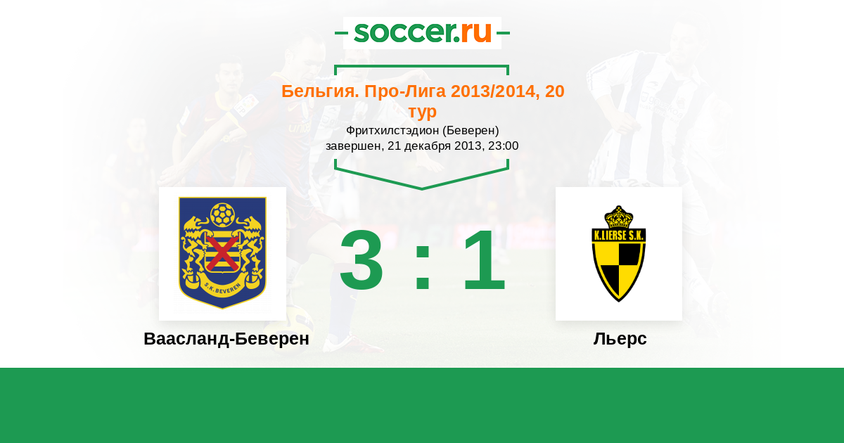 Бельгия. Про-Лига 29.03.2014 Ваасланд-Беверен Логотип футбольный клуб Ваасланд-Беверен 2:0 Логотип футбольный клуб Льерс (Лир) Льерс