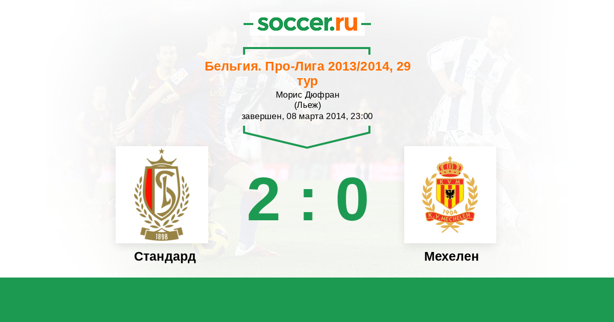 Бельгия. Про-Лига 01.11.2014 Стандард Логотип футбольный клуб Стандард (Льеж) 2:0 Логотип футбольный клуб Мехелен Мехелен