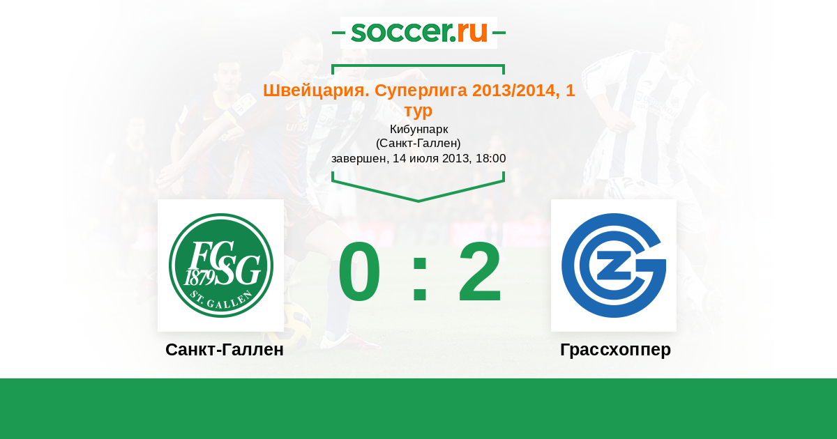Швейцария. Суперлига 28.09.2013 Грассхоппер Логотип футбольный клуб Грассхоппер (Цюрих) 0:1 Логотип футбольный клуб Санкт-Галлен Санкт-Галлен
