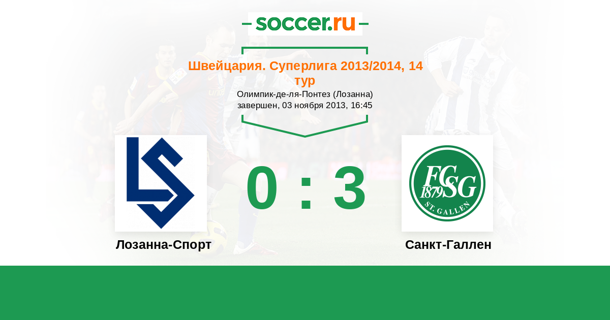 Швейцария. Суперлига 17.04.2014 Санкт-Галлен Логотип футбольный клуб Санкт-Галлен 0:0 Логотип футбольный клуб Лозанна-Спорт Лозанна-Спорт