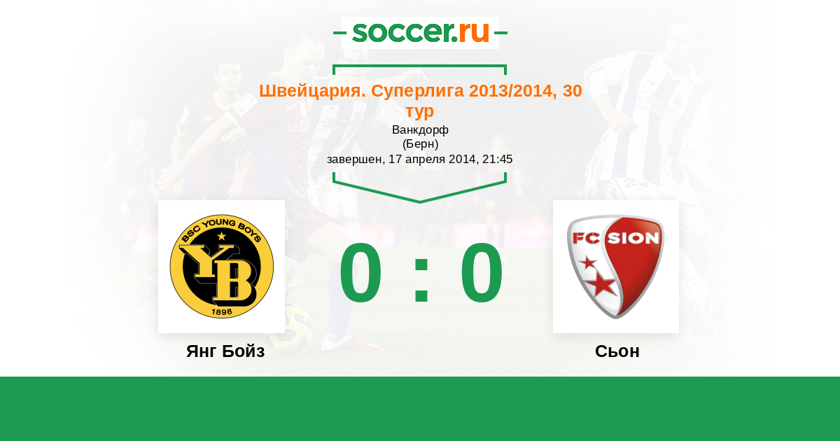Швейцария. Суперлига 21.04.2013 Сьон Логотип футбольный клуб Сьон 0:0 Логотип футбольный клуб Янг Бойз (Берн) Янг Бойз