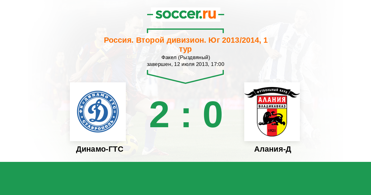Россия. Вторая лига. Группа 1 05.06.2014 Алания-Д Логотип футбольный клуб Алания-Д (Владикавказ) 2:2 Логотип футбольный клуб Газпром-Трансгаз-Ставрополь Газпром-Трансгаз-Ставрополь