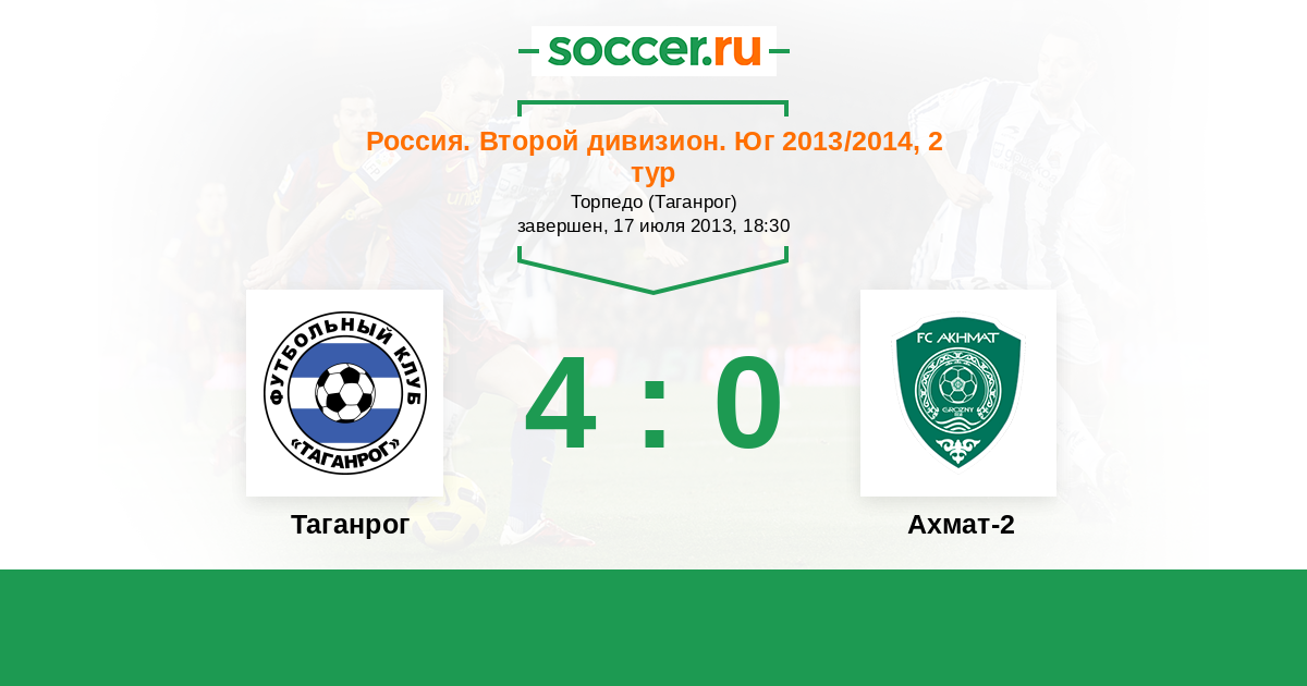 Россия. Вторая лига. Группа 1 15.10.2013 Ахмат-2 Логотип футбольный клуб Ахмат-2 (Грозный) 1:3 Логотип футбольный клуб Таганрог Таганрог