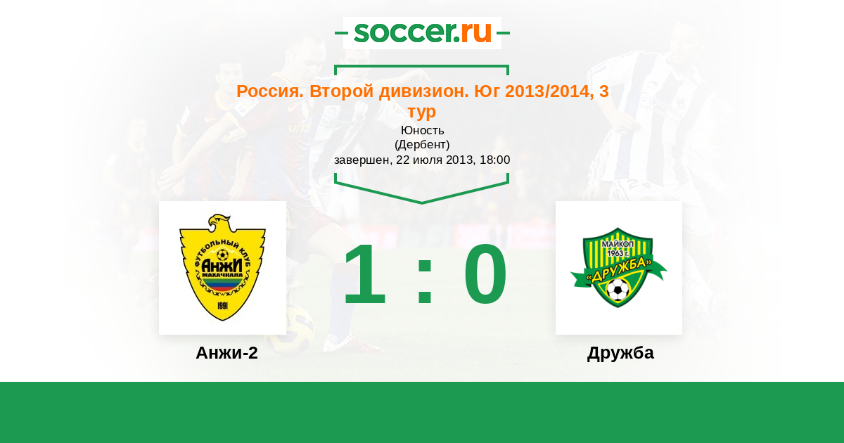 Россия. Вторая лига. Группа 1 20.10.2013 Дружба Логотип футбольный клуб Дружба (Майкоп) 0:1 Логотип футбольный клуб Дагдизель (Махачкала) Дагдизель