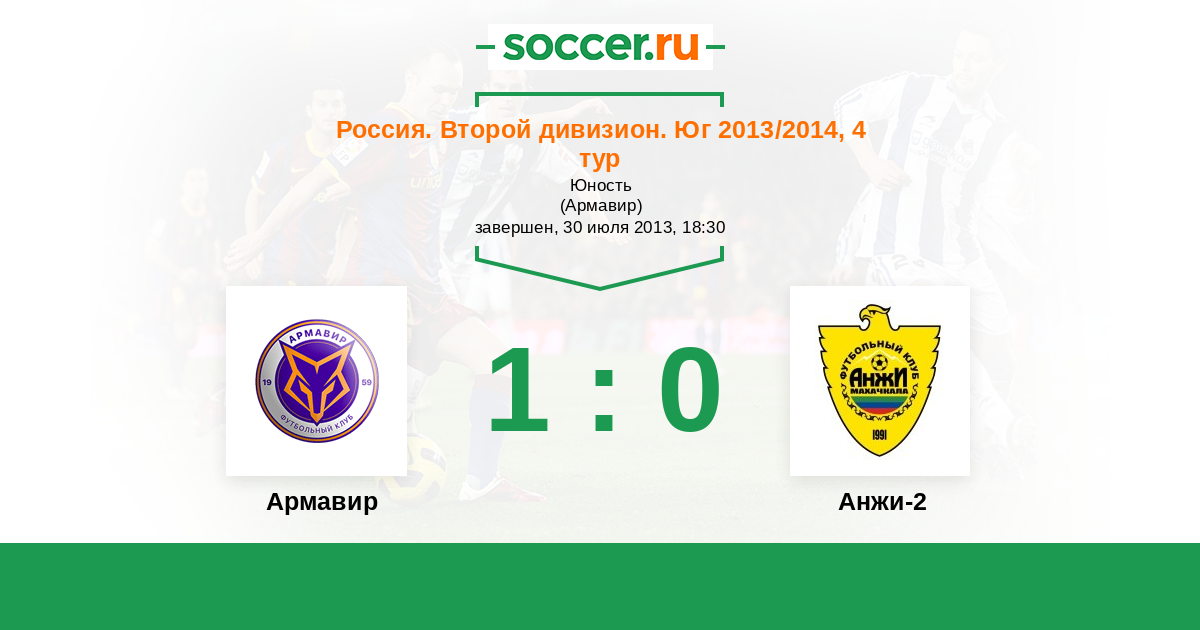 Россия. Вторая лига. Группа 1 13.08.2017 Анжи-2 Логотип футбольный клуб Анжи-2 (Махачкала) 2:1 Логотип футбольный клуб Армавир Армавир