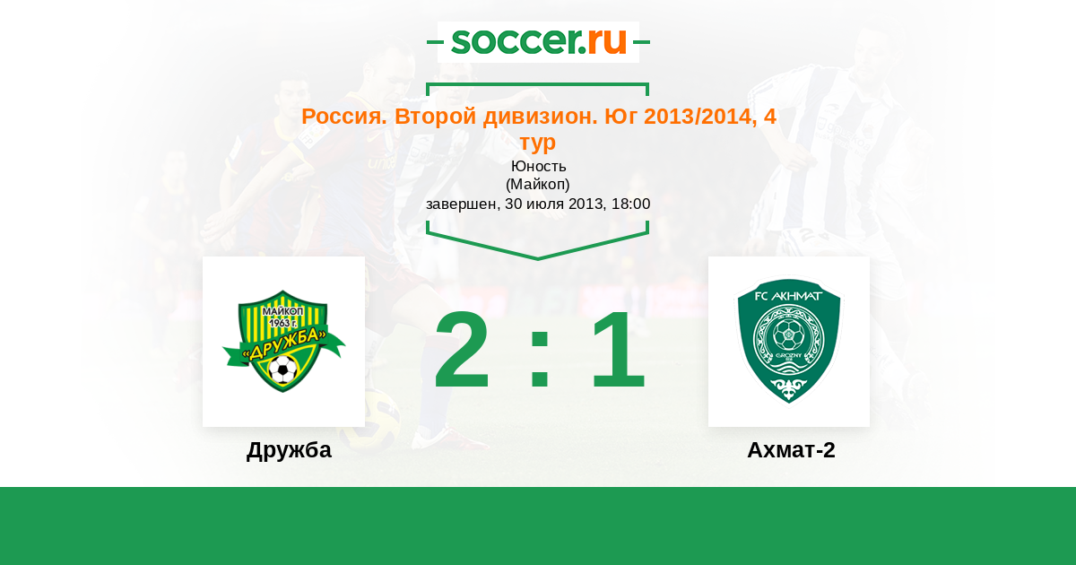Россия. Вторая лига. Группа 1 26.10.2013 Ахмат-2 Логотип футбольный клуб Ахмат-2 (Грозный) 1:0 Логотип футбольный клуб Дружба (Майкоп) Дружба