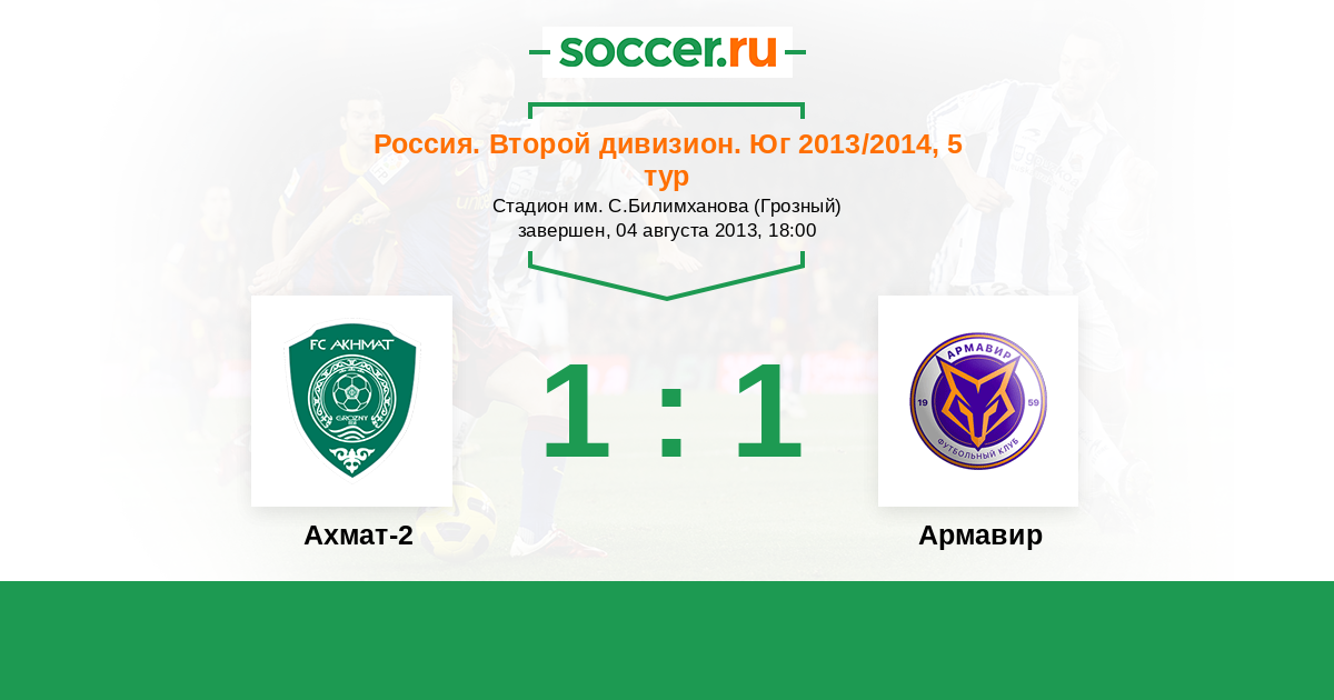 Россия. Вторая лига. Группа 1 01.11.2013 Торпедо Армавир Логотип футбольный клуб Торпедо Армавир 2:2 Логотип футбольный клуб Ахмат-2 (Грозный) Ахмат-2