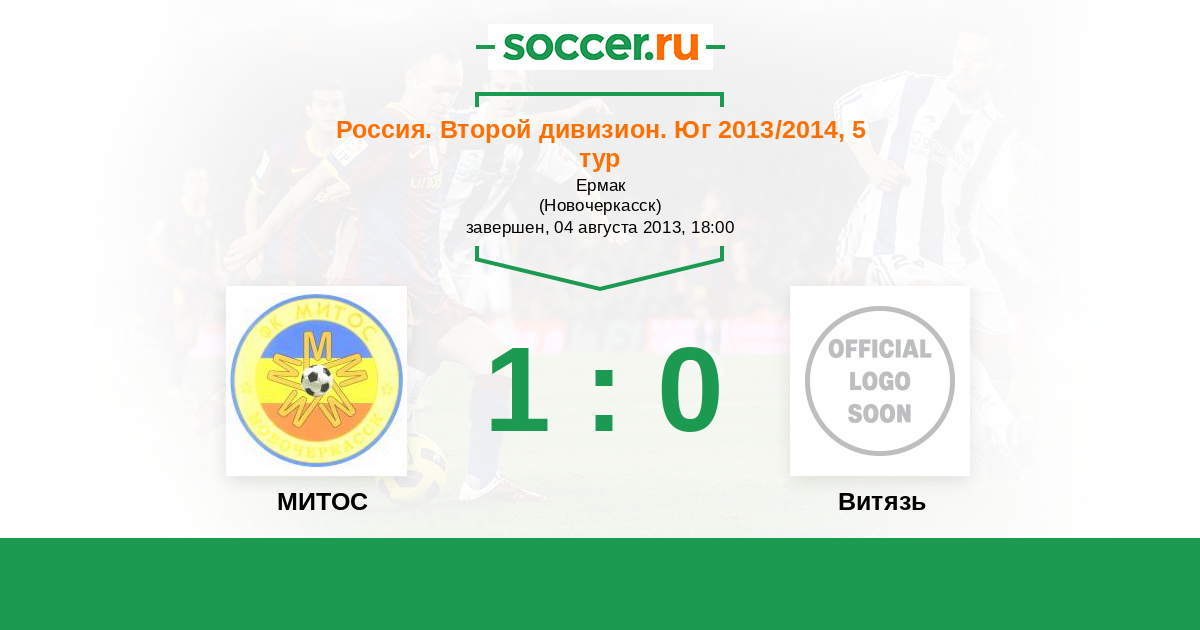 Россия. Вторая лига. Группа 1 01.11.2013 Витязь Логотип футбольный клуб Витязь (Крымск) 0:0 Логотип футбольный клуб МИТОС (Новочеркасск) МИТОС