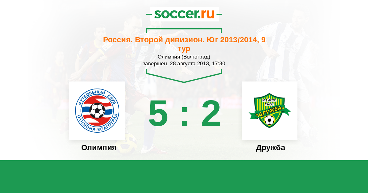 Россия. Вторая лига. Группа 1 15.04.2014 Дружба Логотип футбольный клуб Дружба (Майкоп) 1:1 Логотип футбольный клуб Олимпия (Волгоград) Олимпия