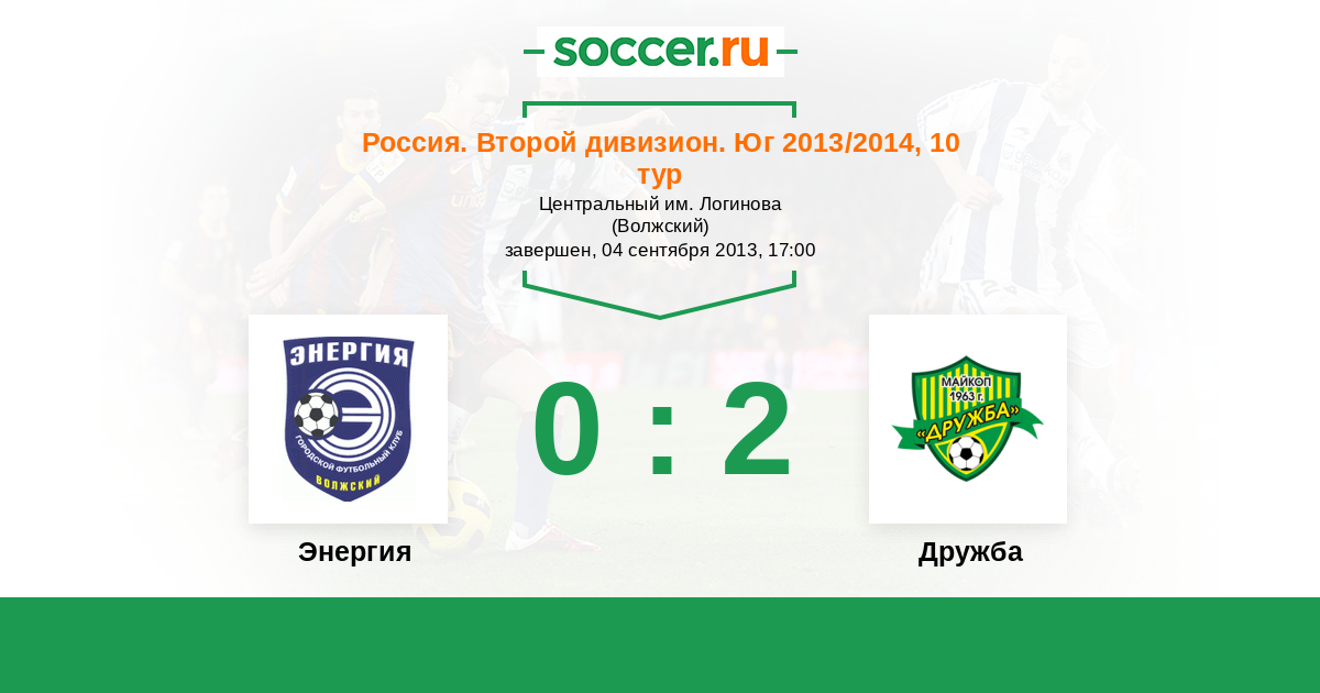 Россия. Вторая лига. Группа 1 08.08.2010 Энергия Логотип футбольный клуб Энергия (Волжский) 1:1 Логотип футбольный клуб Дружба (Майкоп) Дружба