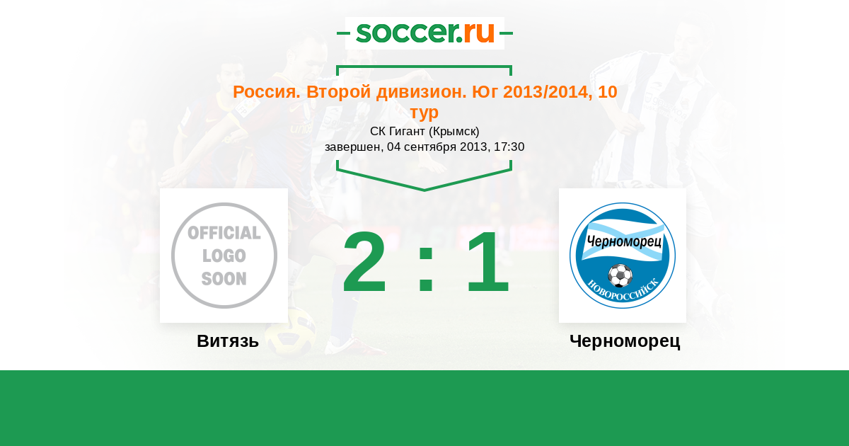 Россия. Вторая лига. Группа 1 20.04.2014 Черноморец Логотип футбольный клуб Черноморец (Новороссийск) 2:1 Логотип футбольный клуб Витязь (Крымск) Витязь