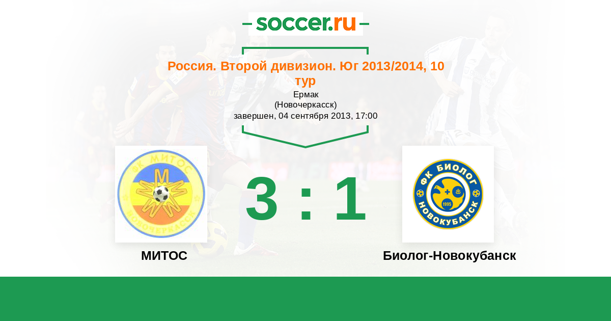 Россия. Вторая лига. Группа 1 06.05.2013 Биолог-Новокубанск Логотип футбольный клуб Биолог-Новокубанск 2:1 Логотип футбольный клуб МИТОС (Новочеркасск) МИТОС
