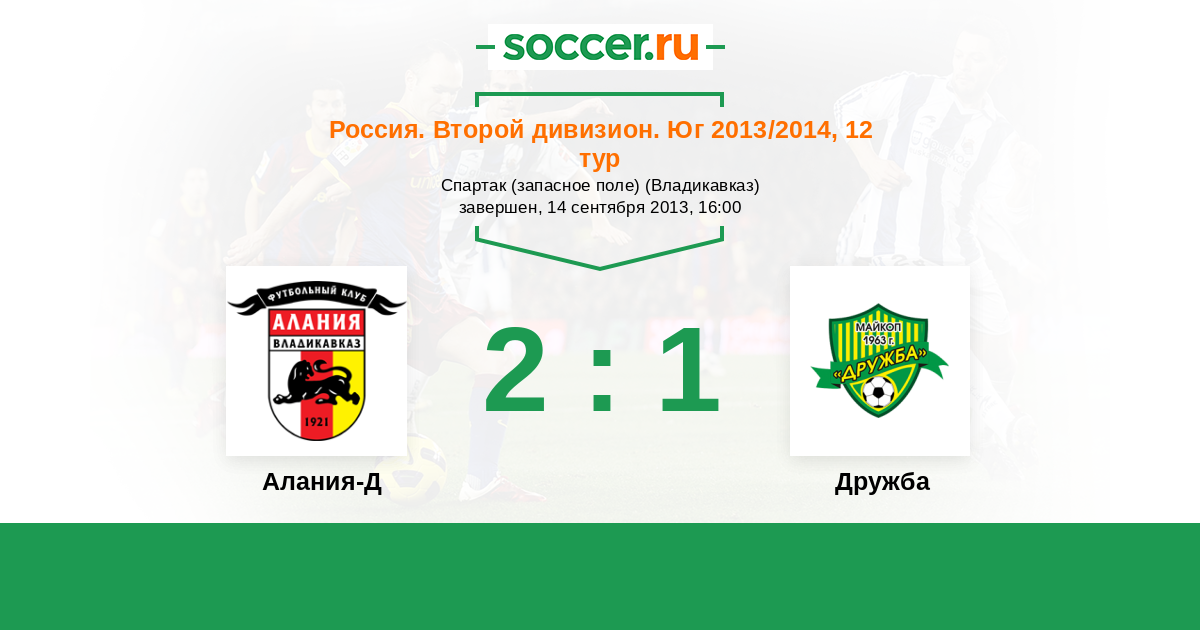 Россия. Вторая лига. Группа 1 02.05.2014 Дружба Логотип футбольный клуб Дружба (Майкоп) 1:0 Логотип футбольный клуб Алания-Д (Владикавказ) Алания-Д