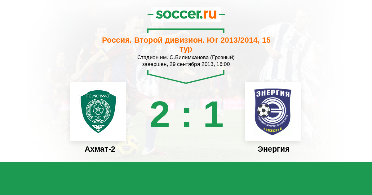 Россия. Вторая лига. Группа 1 19.05.2014 Энергия Логотип футбольный клуб Энергия (Волжский) 2:4 Логотип футбольный клуб Ахмат-2 (Грозный) Ахмат-2