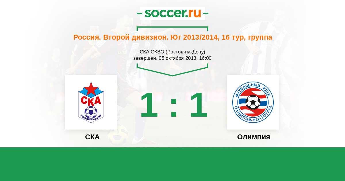 Россия. Вторая лига. Группа 1 10.04.2013 Олимпия Логотип футбольный клуб Олимпия (Волгоград) 3:0 Логотип футбольный клуб СКА (Ростов-на-Дону) СКА