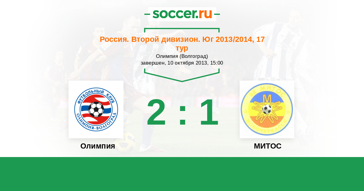 Россия. Вторая лига. Группа 1 31.05.2014 МИТОС Логотип футбольный клуб МИТОС (Новочеркасск) 0:1 Логотип футбольный клуб Олимпия (Волгоград) Олимпия