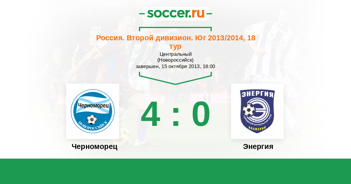 Россия. Вторая лига. Группа 1 17.07.2013 Энергия Логотип футбольный клуб Энергия (Волжский) 1:4 Логотип футбольный клуб Черноморец (Новороссийск) Черноморец