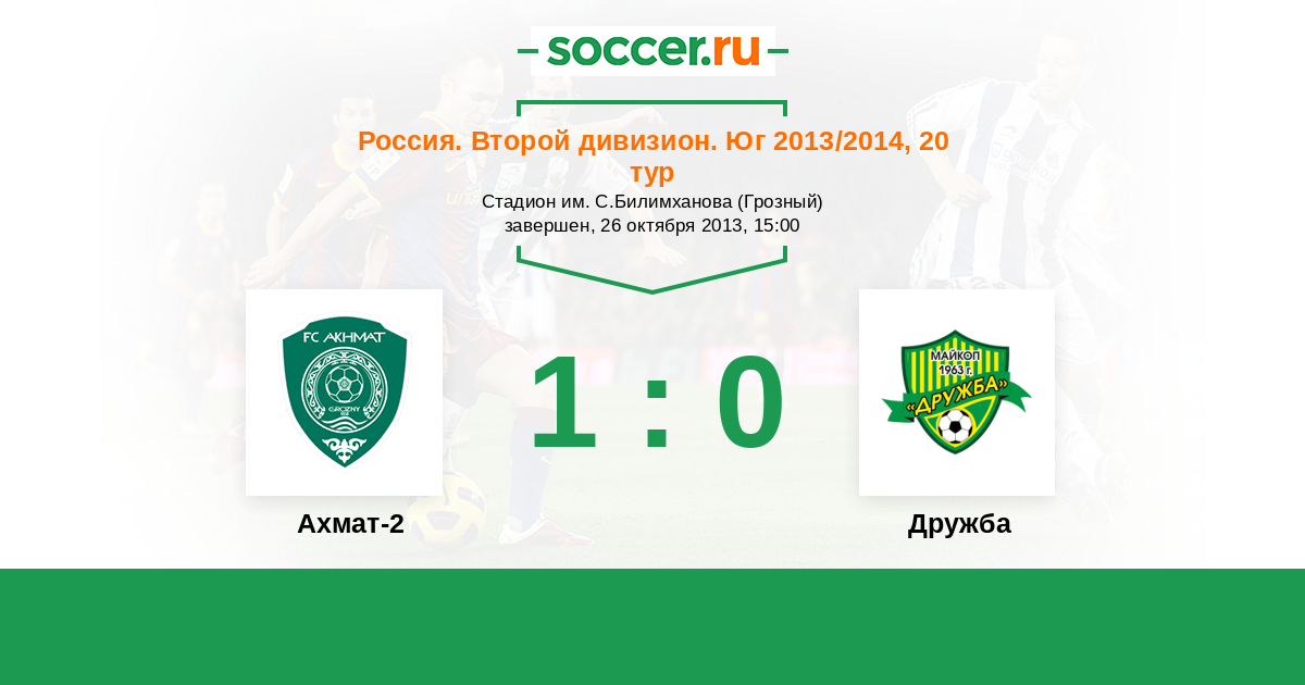 Россия. Вторая лига. Группа 1 30.07.2013 Дружба Логотип футбольный клуб Дружба (Майкоп) 2:1 Логотип футбольный клуб Ахмат-2 (Грозный) Ахмат-2