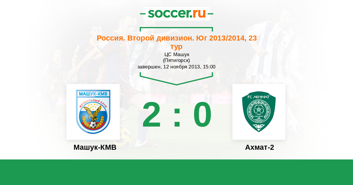 Россия. Вторая лига. Группа 1 17.08.2013 Ахмат-2 Логотип футбольный клуб Ахмат-2 (Грозный) 1:1 Логотип футбольный клуб Машук-КМВ (Пятигорск) Машук-КМВ