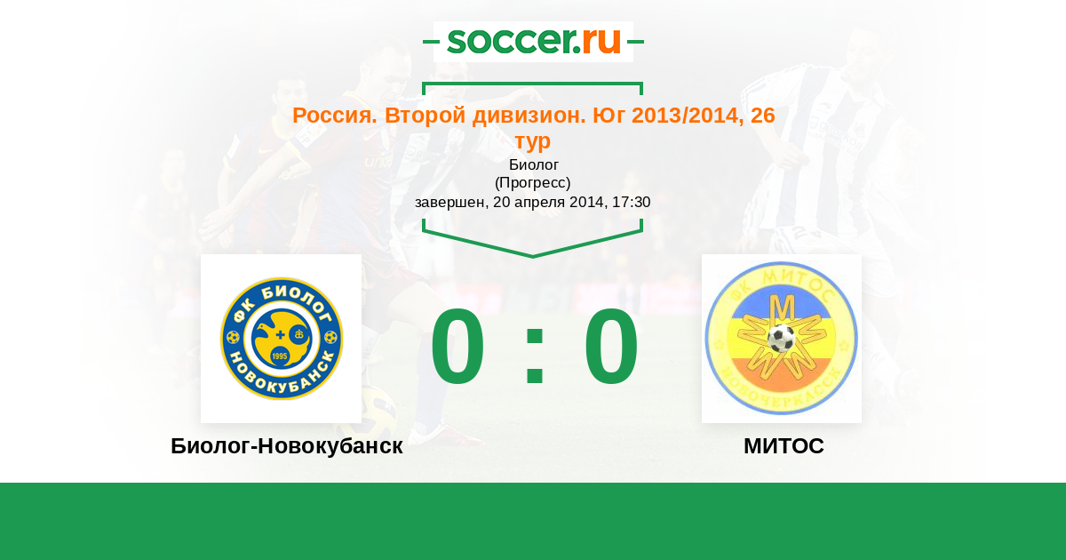 Россия. Вторая лига. Группа 1 04.09.2013 МИТОС Логотип футбольный клуб МИТОС (Новочеркасск) 3:1 Логотип футбольный клуб Биолог-Новокубанск Биолог-Новокубанск