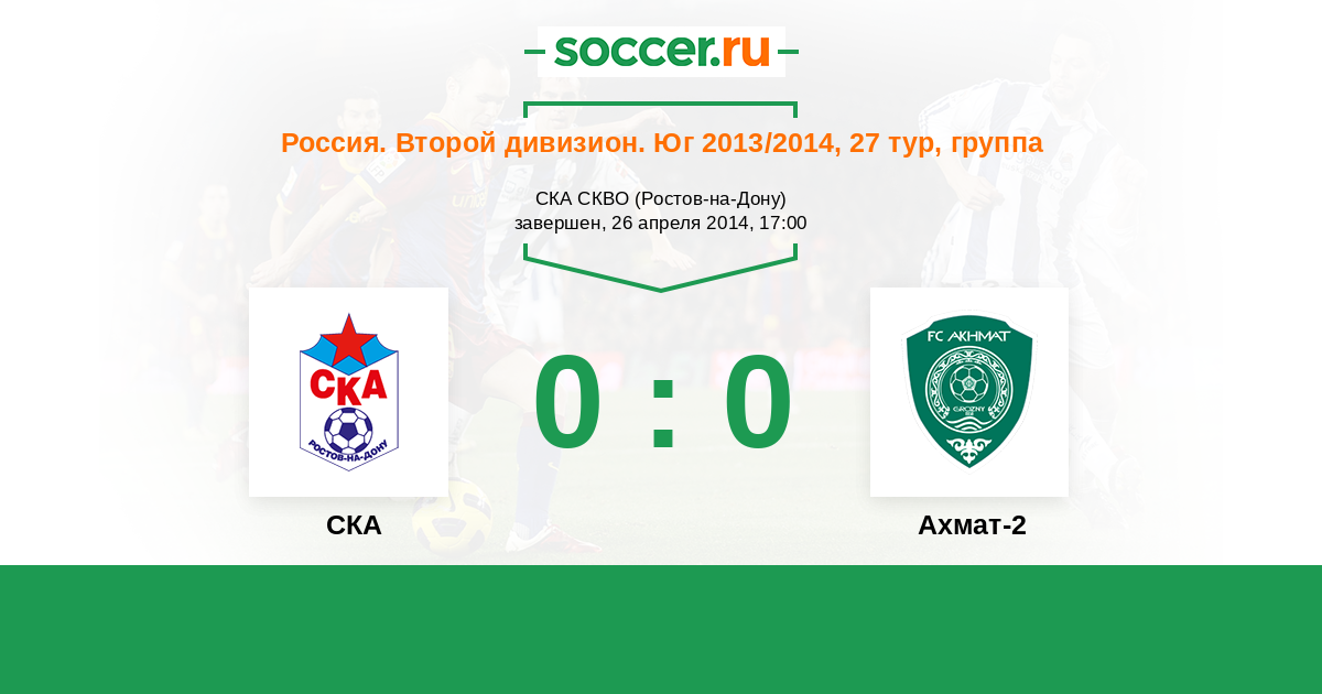 Россия. Вторая лига. Группа 1 09.09.2013 Ахмат-2 Логотип футбольный клуб Ахмат-2 (Грозный) 1:0 Логотип футбольный клуб СКА (Ростов-на-Дону) СКА