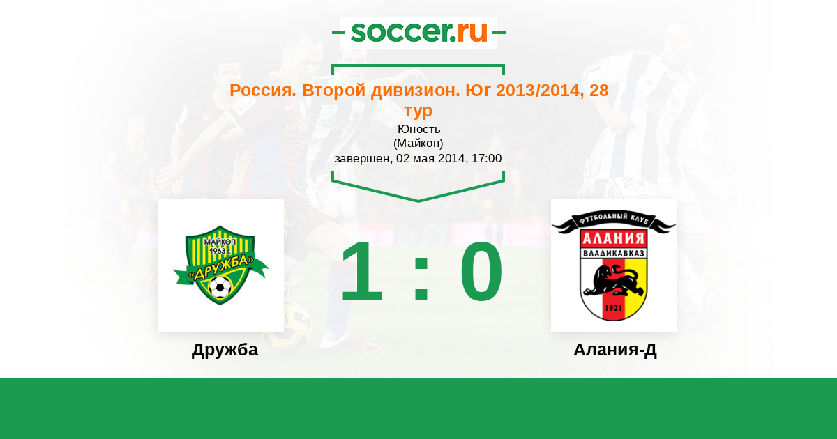 Россия. Вторая лига. Группа 1 02.05.2014 Дружба Логотип футбольный клуб Дружба (Майкоп) 1:0 Логотип футбольный клуб Алания-Д (Владикавказ) Алания-Д