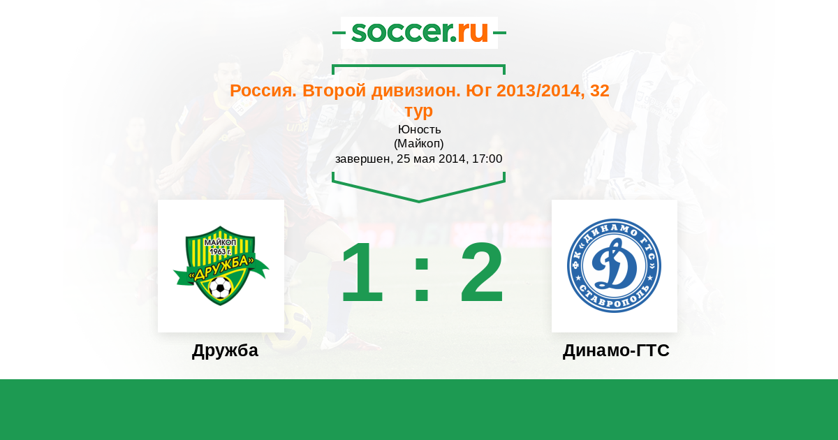 Россия. Вторая лига. Группа 1 14.04.2015 Дружба Логотип футбольный клуб Дружба (Майкоп) 1:1 Логотип футбольный клуб Динамо-ГТС (Ставрополь) Динамо-ГТС