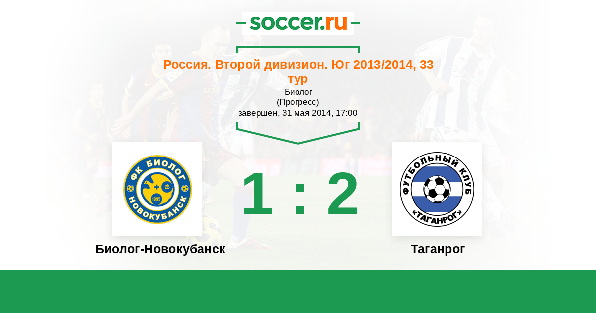 Россия. Вторая лига. Группа 1 05.06.2015 Биолог-Новокубанск Логотип футбольный клуб Биолог-Новокубанск 2:0 Логотип футбольный клуб Таганрог Таганрог