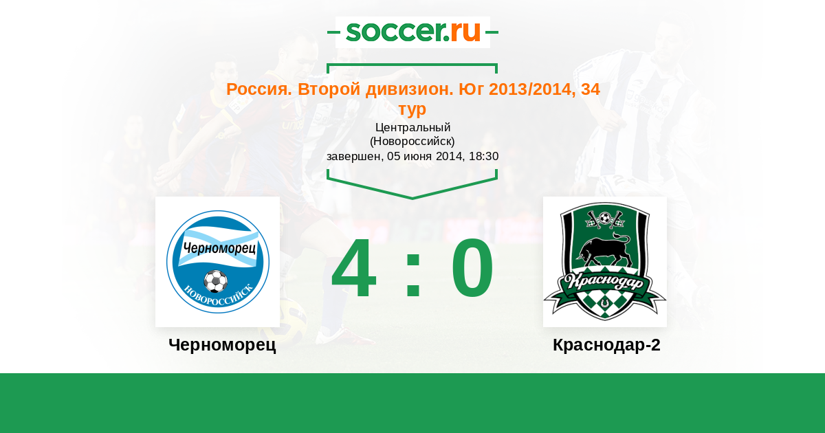Россия. Вторая лига. Группа 1 13.09.2014 Черноморец Логотип футбольный клуб Черноморец (Новороссийск) 3:1 Логотип футбольный клуб Краснодар-2 Краснодар-2