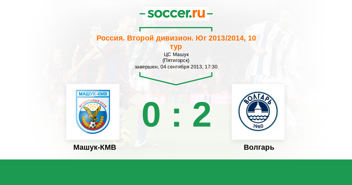 Россия. Вторая лига. Группа 1 20.04.2014 Волгарь Логотип футбольный клуб Волгарь (Астрахань) 3:0 Логотип футбольный клуб Машук-КМВ (Пятигорск) Машук-КМВ