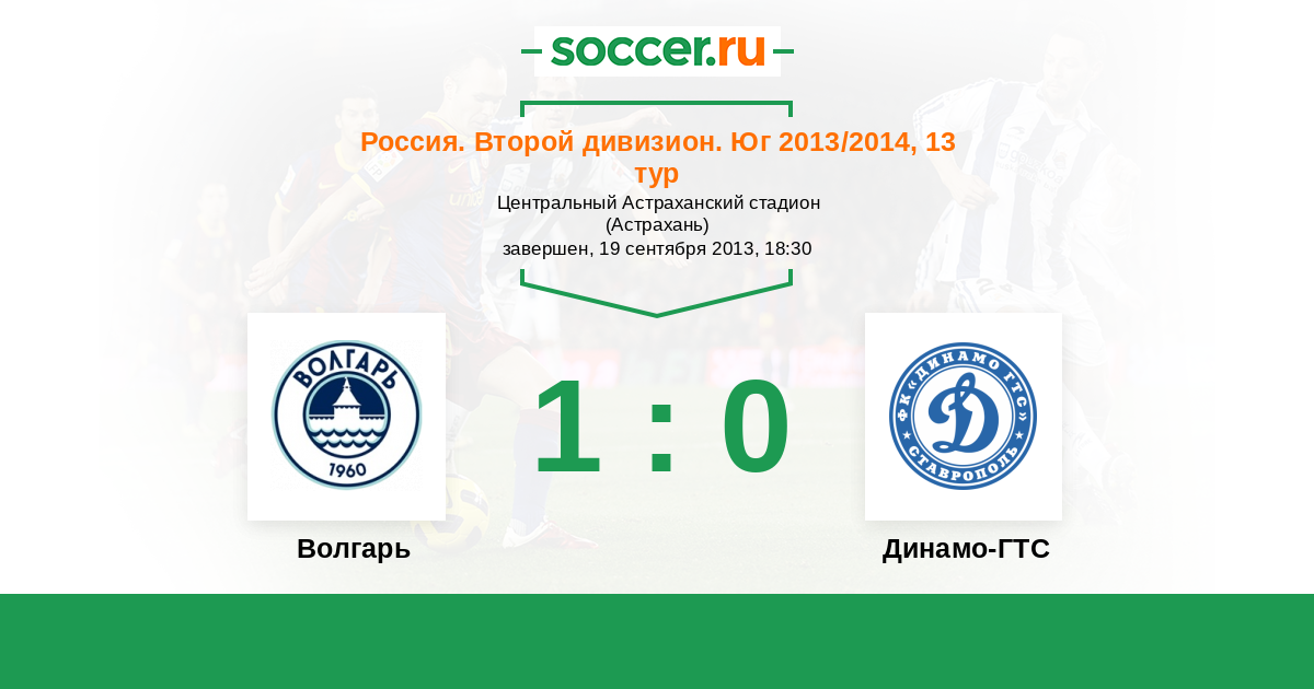 Россия. Вторая лига. Группа 1 11.05.2013 Кавказтрансгаз-2005 Логотип футбольный клуб Кавказтрансгаз-2005 (Ставрополь) 1:1 Логотип футбольный клуб Волгарь (Астрахань) Волгарь
