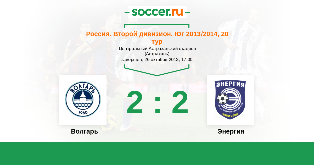 Россия. Вторая лига. Группа 1 30.07.2013 Энергия Логотип футбольный клуб Энергия (Волжский) 2:4 Логотип футбольный клуб Волгарь (Астрахань) Волгарь