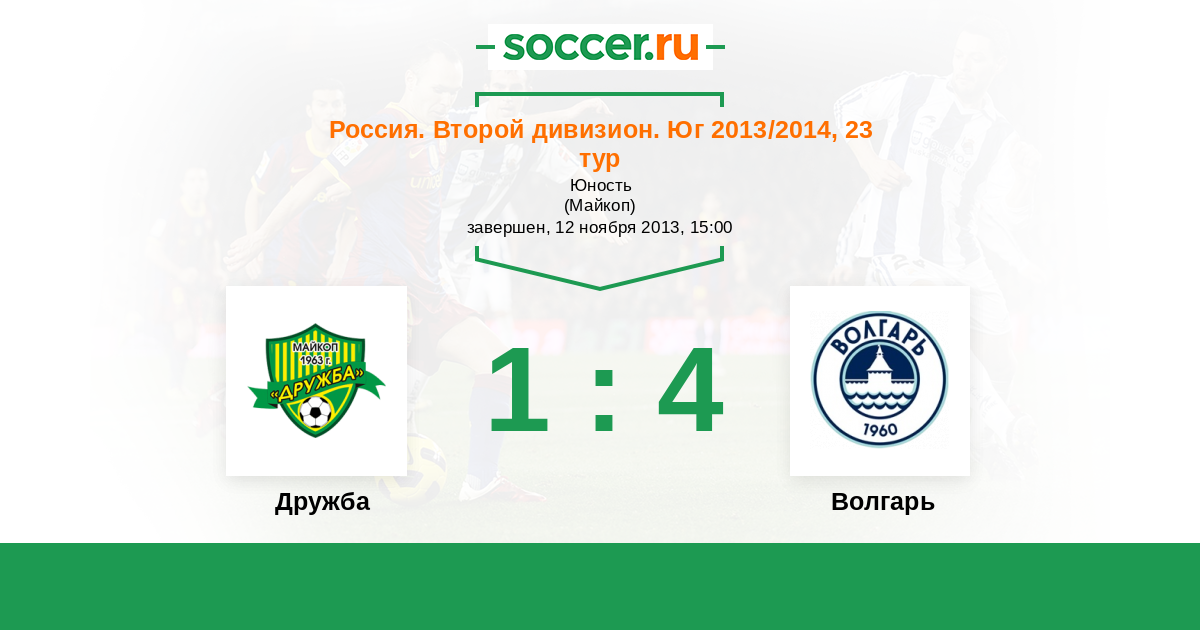 Россия. Вторая лига. Группа 1 01.05.2013 Дружба Логотип футбольный клуб Дружба (Майкоп) 1:1 Логотип футбольный клуб Волгарь (Астрахань) Волгарь