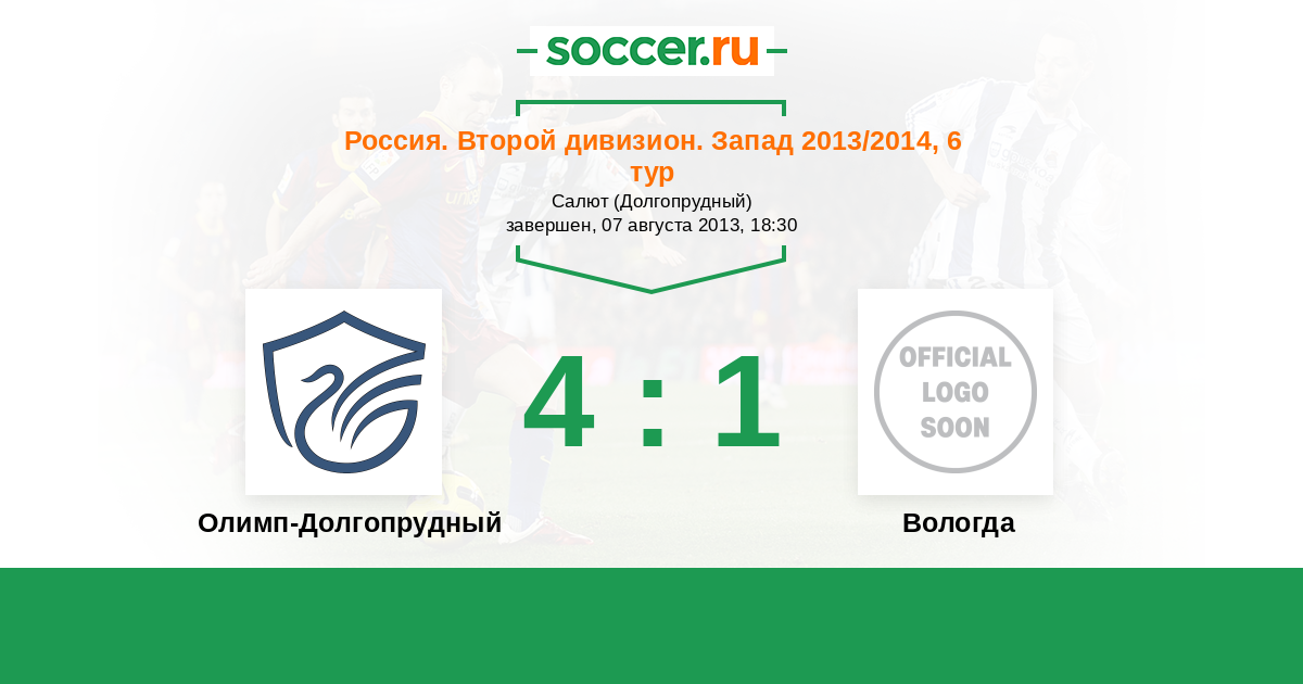 Россия. Вторая лига. Группа 2 06.08.2012 Долгопрудный Логотип футбольный клуб Долгопрудный 2:0 Логотип футбольный клуб Вологда Вологда