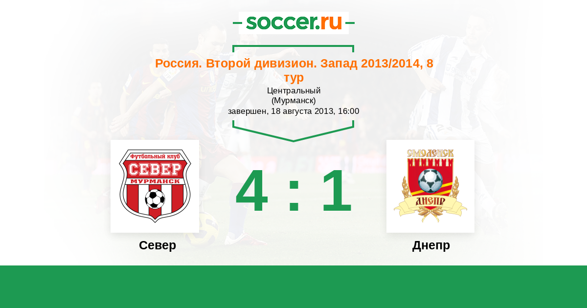 Россия. Вторая лига. Группа 2 11.05.2013 Север Логотип футбольный клуб Север (Мурманск) 2:1 Логотип футбольный клуб Днепр (Смоленск) Днепр