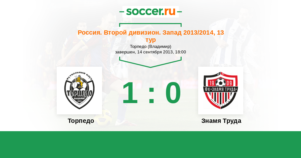 Россия. Вторая лига. Группа 2 02.11.2013 Знамя Труда Логотип футбольный клуб Знамя Труда (Орехово-Зуево) 1:1 Логотип футбольный клуб Торпедо (Владимир) Торпедо