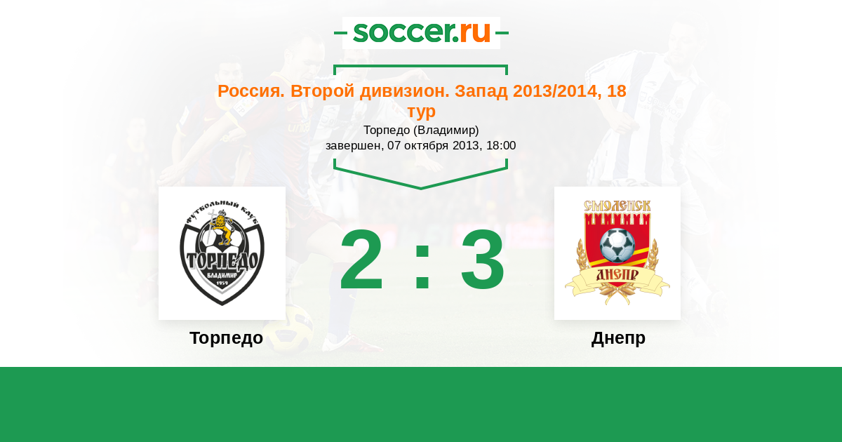 Россия. Вторая лига. Группа 2 17.10.2013 Днепр Логотип футбольный клуб Днепр (Смоленск) 1:1 Логотип футбольный клуб Торпедо (Владимир) Торпедо