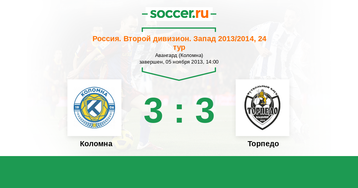 Россия. Вторая лига. Группа 2 17.09.2013 Торпедо Логотип футбольный клуб Торпедо (Владимир) 4:1 Логотип футбольный клуб Коломна Коломна