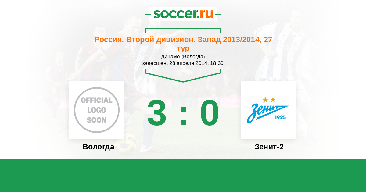 Россия. Вторая лига. Группа 2 28.04.2014 Вологда Логотип футбольный клуб Вологда 3:0 Логотип футбольный клуб Зенит-2 (Санкт-Петербург) Зенит-2