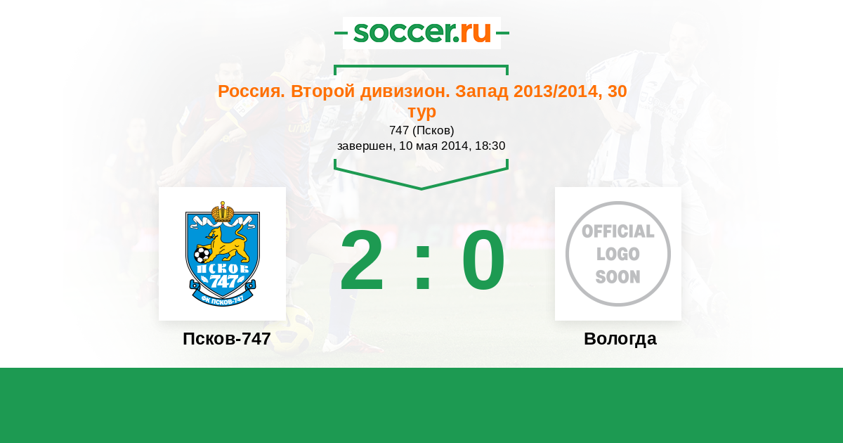 Россия. Вторая лига. Группа 2 10.05.2014 Псков-747 Логотип футбольный клуб Псков-747 2:0 Логотип футбольный клуб Вологда Вологда