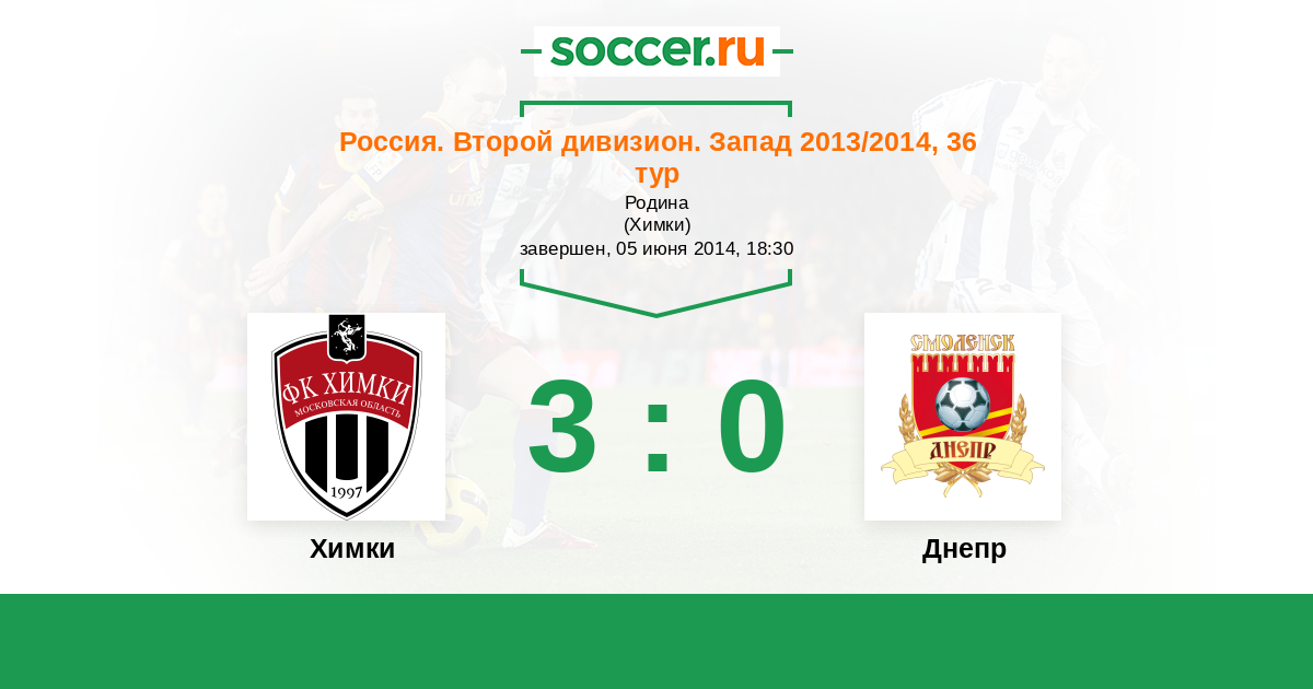 Россия. Вторая лига. Группа 2 18.07.2013 Днепр Логотип футбольный клуб Днепр (Смоленск) 2:0 Логотип футбольный клуб Химки Химки