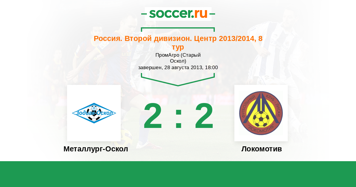 Россия. Вторая лига. Группа 3 21.04.2014 Локомотив Логотип футбольный клуб Локомотив (Лиски) 3:0 Логотип футбольный клуб Металлург-Оскол (Старый Оскол) Металлург-Оскол