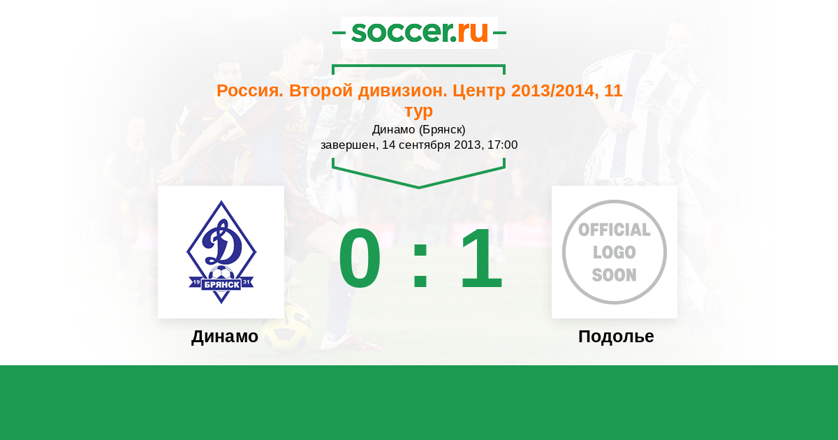 Россия. Вторая лига. Группа 3 04.09.2014 Динамо Брянск Логотип футбольный клуб Динамо Брянск 1:1 Логотип футбольный клуб Подолье (Подольский район) Подолье