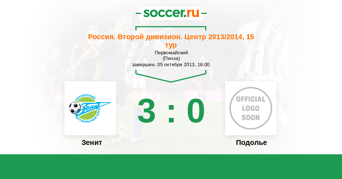 Россия. Вторая лига. Группа 3 23.10.2014 Подолье Логотип футбольный клуб Подолье (Подольский район) 1:3 Логотип футбольный клуб Зенит (Пенза) Зенит