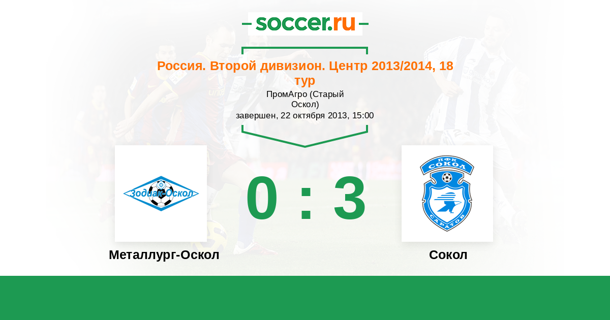 Россия. Вторая лига. Группа 3 04.08.2013 Сокол Логотип футбольный клуб Сокол (Саратов) 1:1 Логотип футбольный клуб Металлург-Оскол (Старый Оскол) Металлург-Оскол