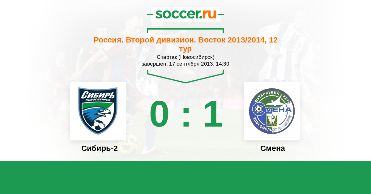 Россия. 2-й дивизион. Восток 08.09.2013 Смена Логотип футбольный клуб Смена (Комсомольск-на-Амуре) 2:0 Логотип футбольный клуб Сибирь-2 (Новосибирск) Сибирь-2