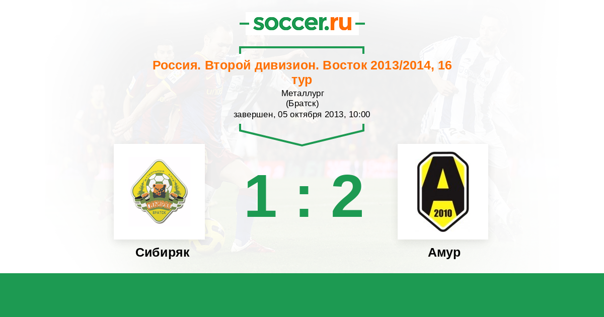 Россия. 2-й дивизион. Восток 17.08.2013 Амур Логотип футбольный клуб Амур  (Благовещенск) 3:0 Логотип футбольный клуб Сибиряк (Братск) Сибиряк