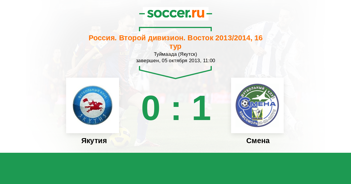Россия. 2-й дивизион. Восток 16.05.2014 Смена Логотип футбольный клуб Смена (Комсомольск-на-Амуре) 2:1 Логотип футбольный клуб Якутия (Якутск) Якутия