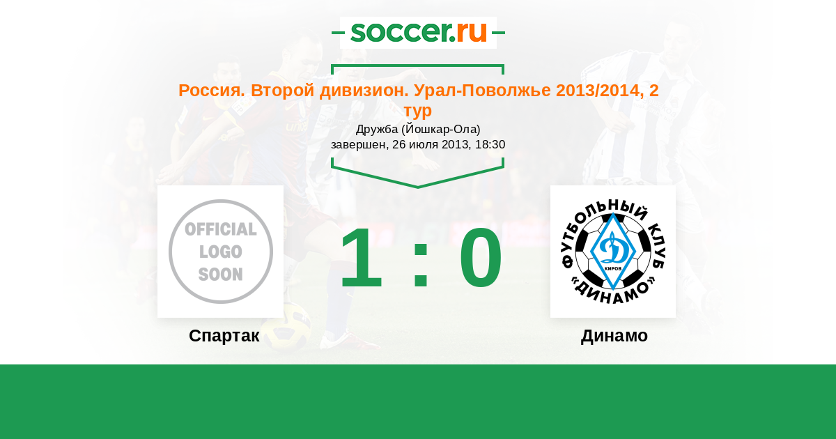 Россия. Вторая лига. Группа 4 06.05.2013 Спартак Логотип футбольный клуб Спартак (Йошкар-Ола) 2:2 Логотип футбольный клуб Динамо Киров Динамо Киров