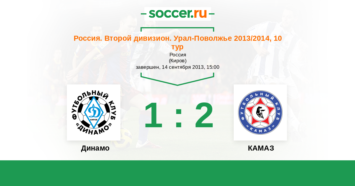Россия. Вторая лига. Группа 4 24.04.2014 КАМАЗ Логотип футбольный клуб КАМАЗ (Набережные Челны) 1:0 Логотип футбольный клуб Динамо Киров Динамо Киров